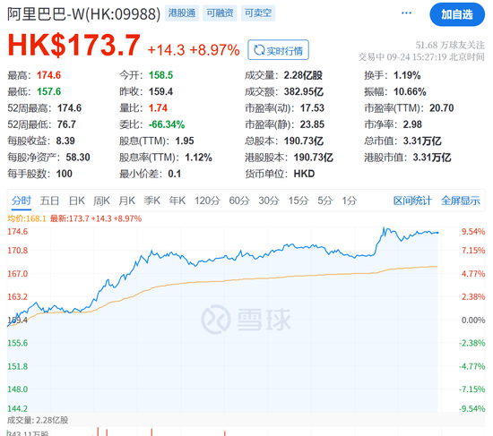 受此消息影响,阿里股价暴涨约9%,带动中国芯片股走强!