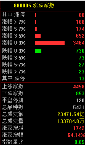 全市场共4458只个股上涨,88只个股涨停,853只个股下跌。