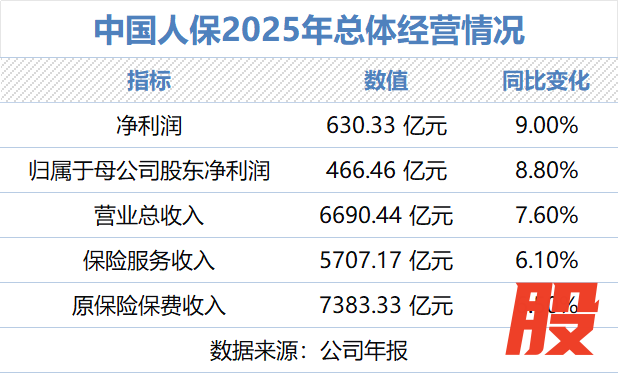 2026年3月26日,中国人民保险集团股份有限公司发布2025年年度报告。年报显示,2025年中国人保实现净利润630.33亿元,同比增长9.0%;归属于母公司股东净利润466.46亿元,同比增长8.8%。